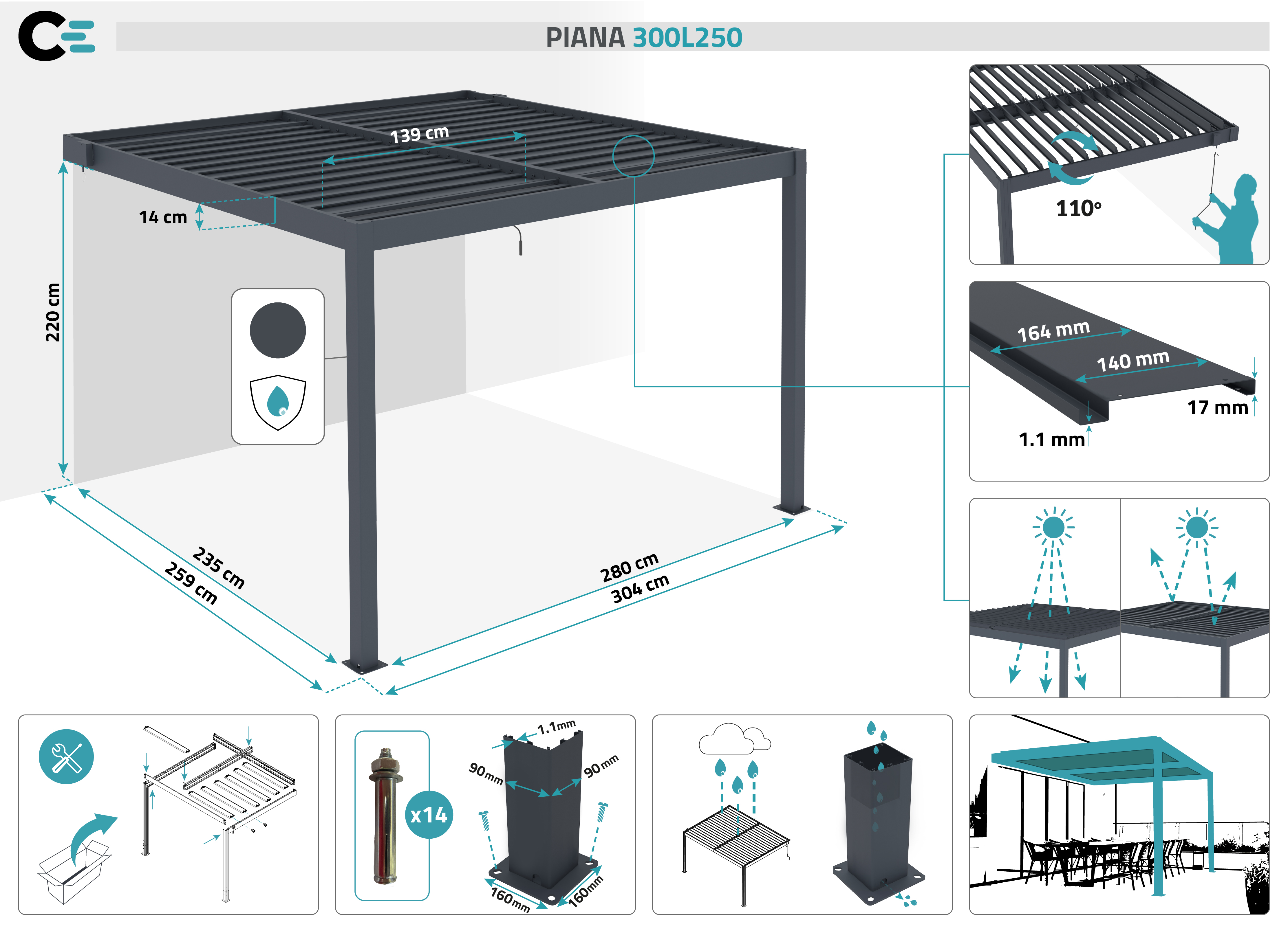 PIANA pritvirtinta bioklimatinė pergolė 3x2,5 m, antracito pilkos spalvos aliuminis